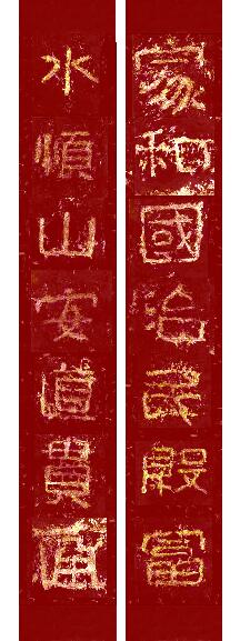 《好太王碑原拓本集联》之一“家和国治民殷富,水顺山安道贯通”,原为墨拓,转为朱拓以应新春。