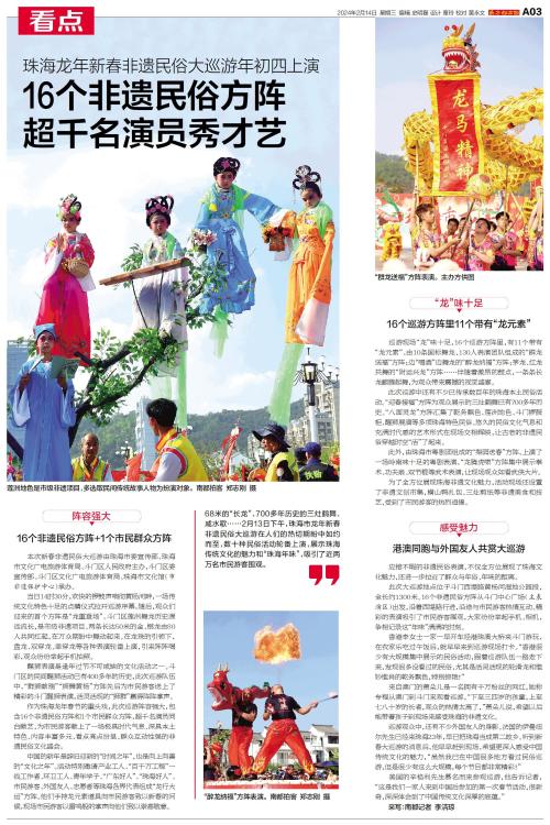 2月13日下午,珠海市龙年新春非遗民俗大巡游在人们的热切期盼中如约而至,数十种民俗活动轮番上演,展示珠海传统文化的魅力和“珠海年味”,吸引了近两万名市民游客围观。