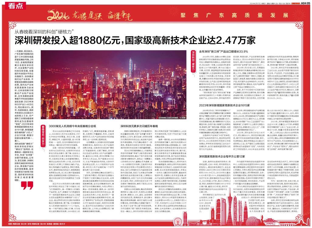 一元复始,旭日始旦。广东在春节假期后的首个工作日即吹响高质量发展的号角。2月18日,全省高质量发展大会将在深圳召开,大会聚焦产业和科技互促双强,全面提升科技高水平自立自强能力,加快建设现代化产业体系,不断塑造发展新动能新优势。现代化产业体系更具竞争力的深圳,以科技创新引领推动产业和产品创新,去年亮眼的成绩单离不开科技创新的坚实支撑:2023年深圳GDP达3.46万亿元,同比增长6%。其中,先进制造业、高技术制造业占比超过六成的规上工业,总产值和工业增加值连续两年成为全国城市“双冠”;2023年深圳新增国家高新技术企业1615家,新增国家级专精特新“小巨人”企业309家,数量分别居全国城市第一、第二。