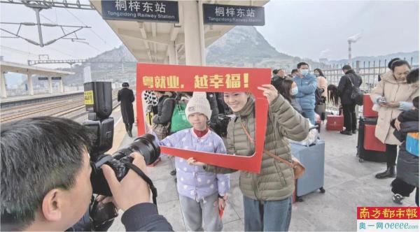 2月15日17点13分,从贵州桐梓站出发的D1831次列车载着600余名贵州籍务工人员抵达广州南站,顺利返粤开工。这是广东省人社厅和贵州省人社厅共同打造的全国首趟返粤专列。务工人员在温暖的春天里重逢大湾区,助力2024年广东高质量发展。