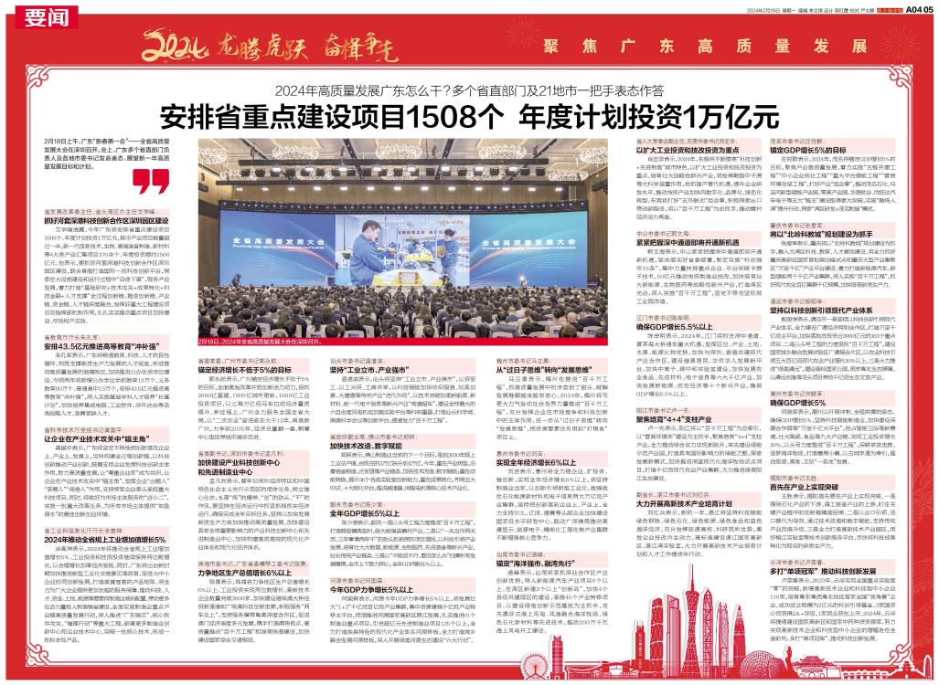 涂高坤表示,2024年将推动全省规上工业增加值增长5%、工业投资和技改投资继续保持两位数增长,以合理增长加厚经济底板。同时,广东将出台新时期加快推进新型工业化实施意见等政策,促进大中小企业协同创新发展,打造美誉度高的产品矩阵。将全力为广大企业提供更加优越的服务保障,推动科技、人才、资金、土地、能源等要素向制造业倾斜配置,带动更多社会力量投入制造强省建设,全面实施制造业重点产业链高质量发展行动,深入推进“广东强芯”、核心软件攻关、“璀璨行动”等重大工程,新建更多制造业创新中心和企业技术中心,突破一批核心技术、形成一批标志性产品。