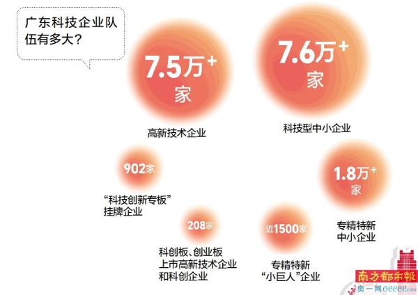 根据广东省科技厅公布的最新数据,广东省高新技术企业数量超7.5万家,占全国1/6,连续八年位居全国第一,全省科技型中小企业数量超7.6万家,专精特新中小企业超1.8万家,专精特新“小巨人”企业近1500家。还有一大批广东科创企业借力多层次资本市场实现跨越式成长。截至2023年末,广东省累计有208家高新技术企业和科创企业在科创板、创业板上市,数量位居全国第一,全年新增上市科技型企业50家,“科技创新专板”挂牌企业累计达902家。广晟集团、广州科学城、深圳创新投、珠海格力等27家企业发行43只科创债、融资402.9亿元,约占全国的1/10。