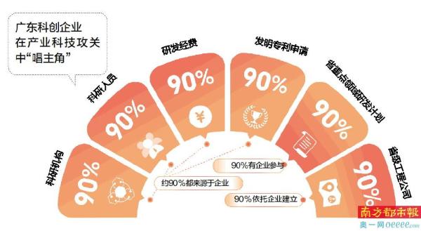 数据显示,广东科创铁军规模大、冲劲强,已成为支撑制造业当家的主力军,创造了6个“90%”:广东约90%的科研机构、90%的科研人员、90%的研发经费、90%的发明专利申请都来源于企业;全省重点领域研发计划中企业参与项目超过90%;依托企业建立的省级工程中心占比近90%。