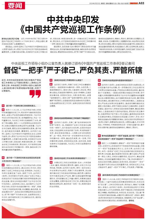 近日,中共中央印发新修订的《中国共产党巡视工作条例》。