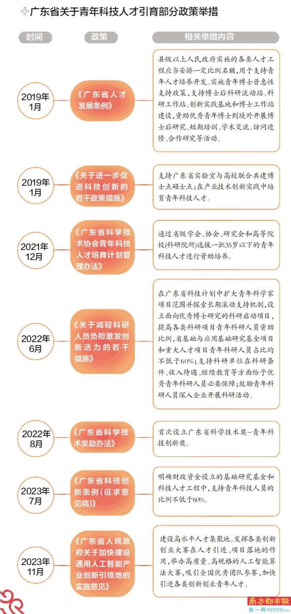 为给予青年科技人才更多的支持和机会,鼓励他们勇挑大梁、当主角,从2019年起,广东陆续发布多项相关政策举措。2019年1月出台的《广东省人才发展条例》以立法的形式规范了人才引进尤其是青年人才的需求导向等。更多支持政策的探索也在路上。为减少资助渠道受限、难以专注研发等方面的困难,2021年12月,广东提出通过省级学会、协会、研究会和高等院校(科研院所)选拔一批35岁以下的青年科技人才进行资助培养;省科技厅党组成员、副厅长吴世文透露,广东将设置从35岁到45岁的多条“赛道”,给青年人才提供不同程度的项目支持,资金从10万元到300万元不等。2022年6月,广东出台《关于减轻科研人员负担激发创新活力的若干措施》,提出将探索长期滚动支持机制,支持科研单位在科研条件、收入待遇、继续教育等方面给予优秀青年科研人员必要保障。为解决“熬资历”问题,广东规定,省基础与应用基础研究基金项目和重大人才项目青年科研人员占比均不低于60%。职称晋升也有解决办法,广东于2022年8月出台《广东省科学技术奖励办法》,首次提出设立广东省科学技术奖-青年科技创新奖;广东也破除“四唯”等对青年科技人才评价的障碍,设置分类评价指标,优化评价制度。