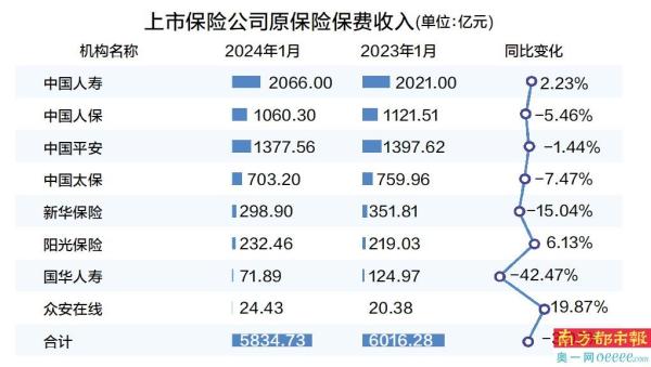 近日,中国人保公布了2024年1月的原保险保费收入报告,至此,A股5家上市保险公司及部分H股上市公司1月保费悉数发布。整体来看,2024年上市险企开年并不顺利。据统计,8家险企1月共实现保费收入5834.73亿元,同比下降3.02%。