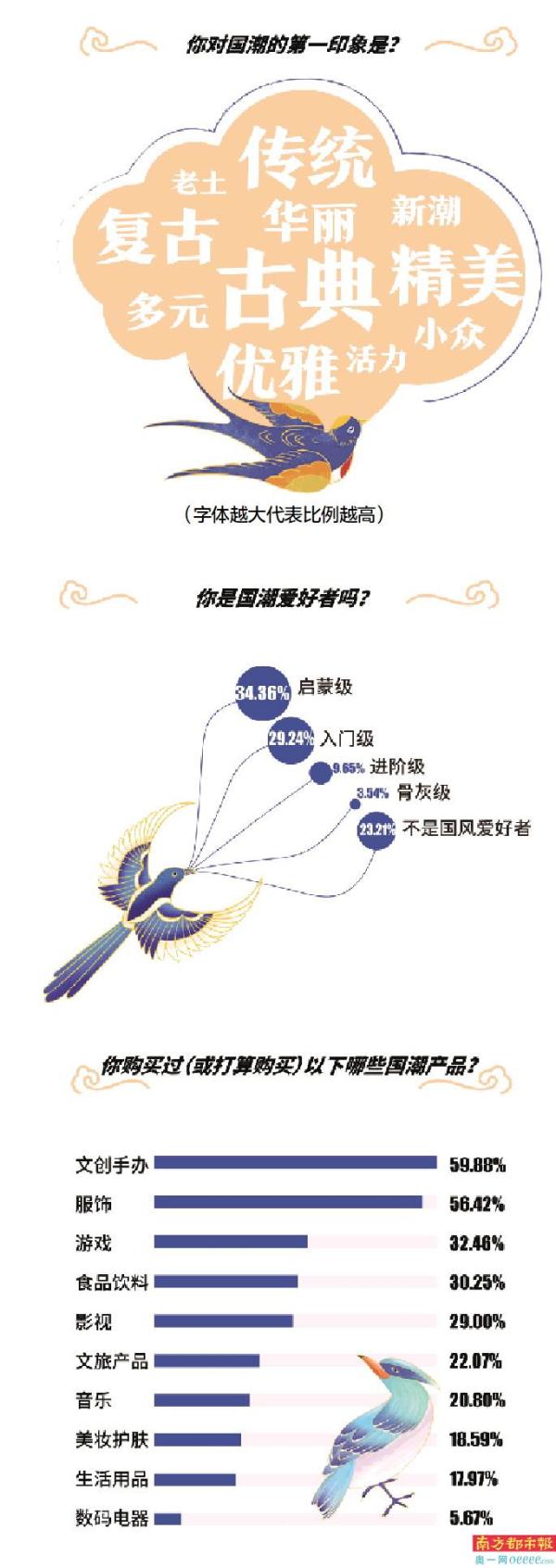 事实上,像一诺这样的国潮爱好者不在少数。《中国网信》杂志相关数据显示,超九成受访青年表示喜欢国潮,尤其是18岁以下的受访者对国潮更热衷。南都大数据研究院民调结果亦呈现相同趋势,近八成受访青年认为自己是国潮爱好者,其中“启蒙级”占34.36%,“入门级”占29.24%。从不同年龄段来看,约有35%的95后受访者认为自己达到“进阶”级别。