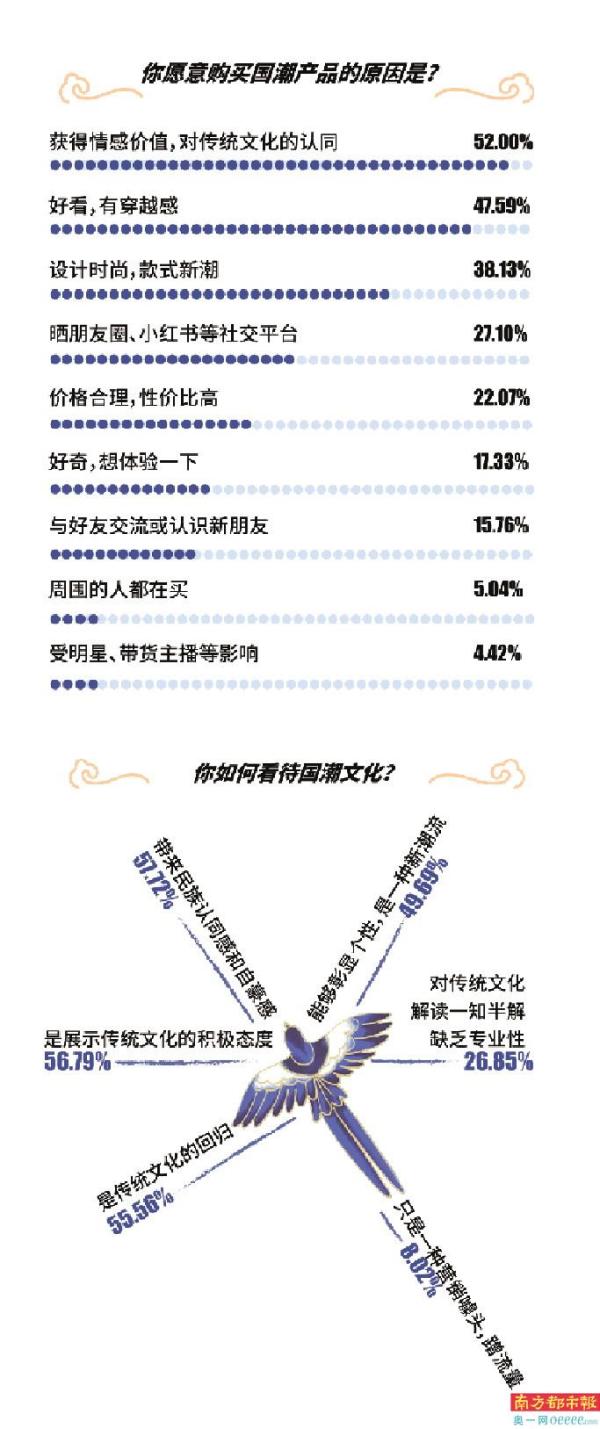 年轻人“花式”爱上国潮的背后,体现了什么?调查结果显示,受访青年认为国潮文化带来民族认同感和自豪感、是展现传统文化的积极态度,是传统文化的回归,选择比例均在五成半以上。