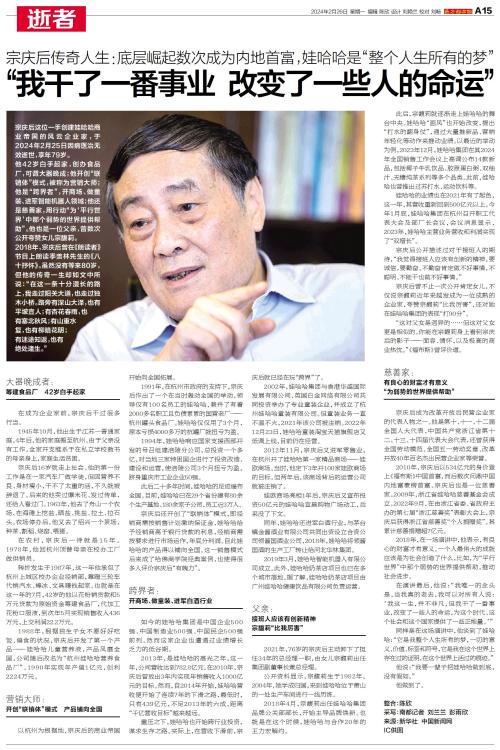 宗庆后这位一手创建娃哈哈商业帝国的风云企业家,于2024年2月25日因病医治无效逝世,享年79岁。