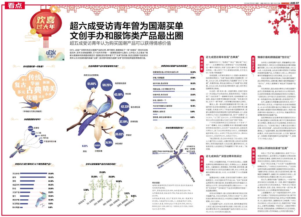 68%,这是广深青年购买过国潮产品的比例。春节期间,国潮掀起了一阵“龙卷风”:穿龙年战袍逛花市,龙年文创销量爆款,打卡龙年吉祥物……