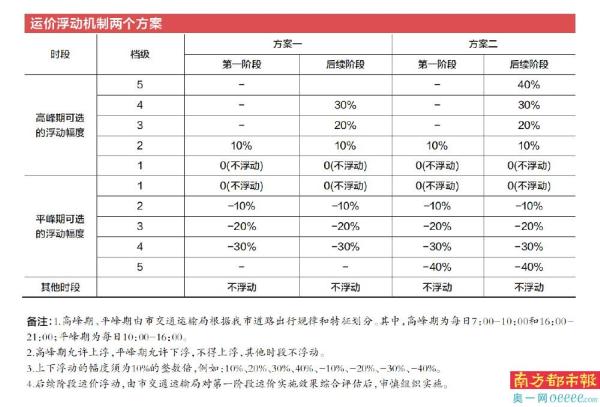后续阶段:运价浮动按需启动,高峰期浮动幅度将逐步扩大到30%(方案一)或40%(方案二),由市交通运输局对第一阶段运价实施效果综合评估后组织实施。