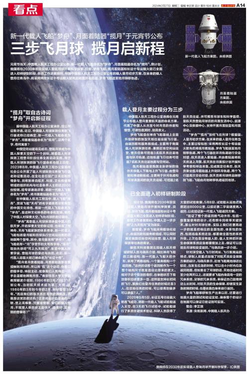 元宵节当天,中国载人航天工程办公室公布,新一代载人飞船命名为“梦舟”,月面着陆器命名为“揽月”。