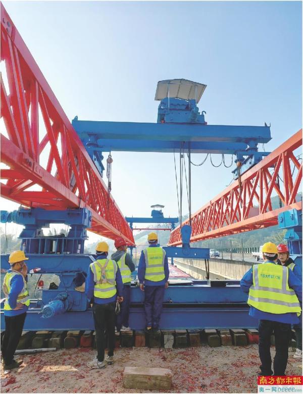 汕梅高速改扩建项目首片预制梁在轩坑河大桥成功架设。 南方日报记者 石磊 摄