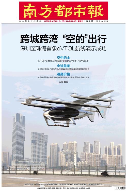 2月27日下午,一架5座eVTOL航空器搭载模拟人,从深圳蛇口邮轮母港飞至珠海九洲港码头。