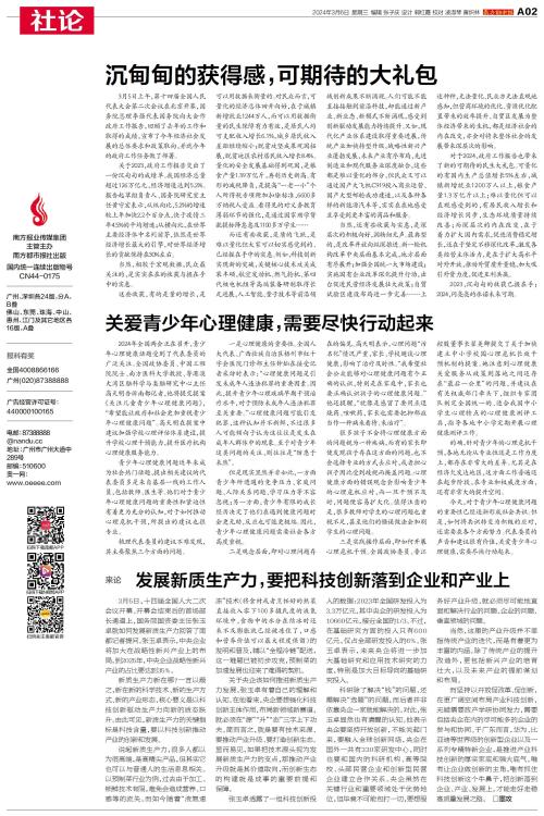 3月5日,十四届全国人大二次会议开幕。开幕会结束后的首场部长通道上,国务院国资委主任张玉卓就如何发展新质生产力回答了南都记者提问。