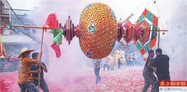 2月22日,江门开平市水口镇泮村国家级非遗泮村灯会。花灯在鞭炮声和醒狮的伴随下巡游。 IC供图