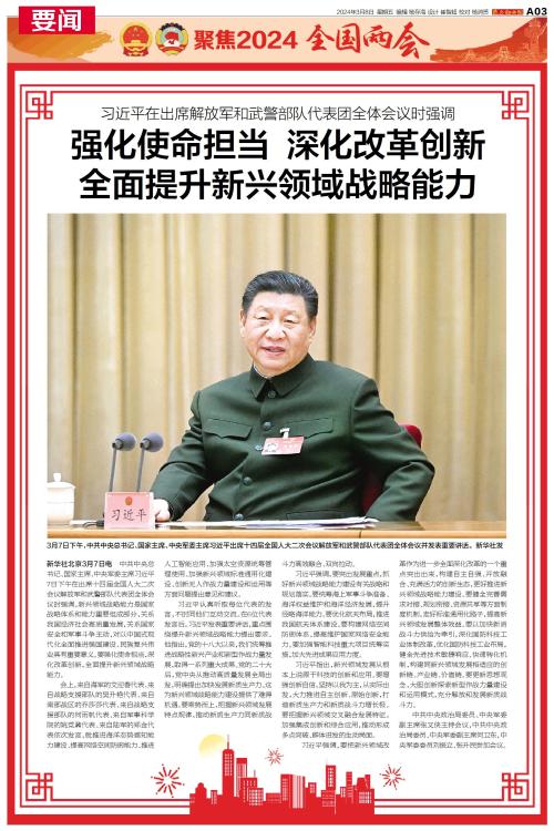 中共中央总书记、国家主席、中央军委主席习近平出席十四届全国人大二次会议解放军和武警部队代表团全体会议并发表重要讲话。