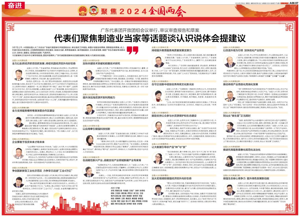 3月7日上午,十四届全国人大二次会议广东省代表团举行开放团组会议,审议政府工作报告,审查计划报告和草案、预算报告和草案。