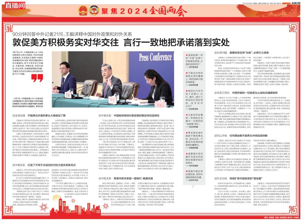 3月7日,十四届全国人大二次会议在北京梅地亚中心举行记者会。中共中央政治局委员、外交部长王毅就中国外交政策和对外关系回答中外记者提问。