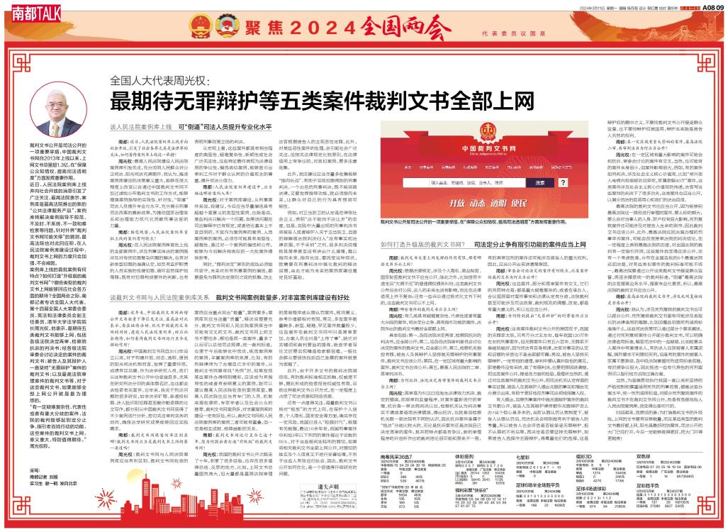 案例库上线的首批案例有何特点?如何打造“升级版的裁判文书网”?哪些类型的裁判文书上网能够回应社会各方面的期待?全国两会之际,南都记者专访全国人大代表、第十四届全国人大常委会委员、宪法和法律委员会副主任委员,清华大学法学院院长周光权。他表示,最期待五类裁判文书能够上网,包括各级法院决定再审、检察院抗诉的判决书;经各级法院审委会讨论决定的案件的裁判文书;被告人及其辩护人一直坚持“无罪辩护”案件的裁判文书;以及最高法院审理案件的裁判文书等,对于这些裁判文书,如果能够全部上网公开就是最为理想的。