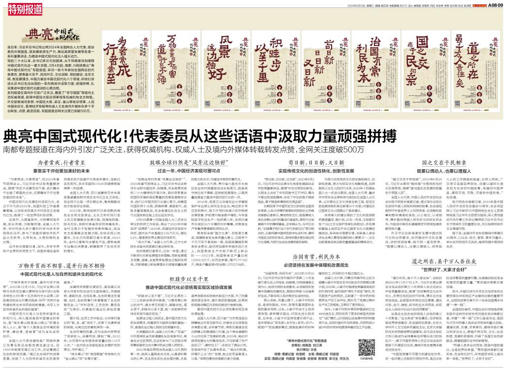 3月4日起,南都、N视频推出“典亮中国式现代化”专题报道,采访一批今年参加全国两会的代表委员,聚焦奋斗实干、民间外交、文化创新、党的建设、生态文明、新发展理念、中国方案及中国式现代化八个领域,听他们讲