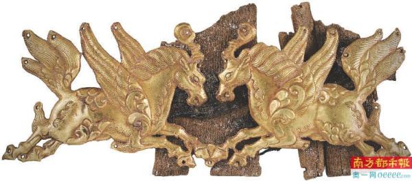 独角翼马形牌饰(7至9世纪),金、木、漆、皮革制作。梦蝶轩捐赠。