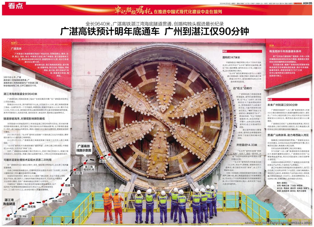 3月15日上午,广湛高铁湛江湾海底隧道贯通。广湛高铁湛江湾海底隧道为广州至湛江高铁全线控制性工程,已开工建设33个月。
