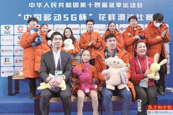 十四冬花样滑冰公开组团体赛女单自由滑后,广东队全队都在陪刘玉萱(前排左二)等待成绩。北京冬奥会冠军隋文静(后排左三)十四冬期间也是广东队教练组成员之一。