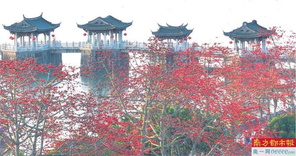在潮州古城,三月盛开的鲜花也为旅游经济“添砖加瓦”。进入三月中旬,韩山韩水、古城古桥尽是绿树红花,姹紫嫣红构建了一幅人与自然、城市和谐共生的优美画卷。特别是木棉花盛放红彤彤,映衬着横跨韩江之上的广济桥,更显秀美如画,引得市民游客竞相“打卡”。