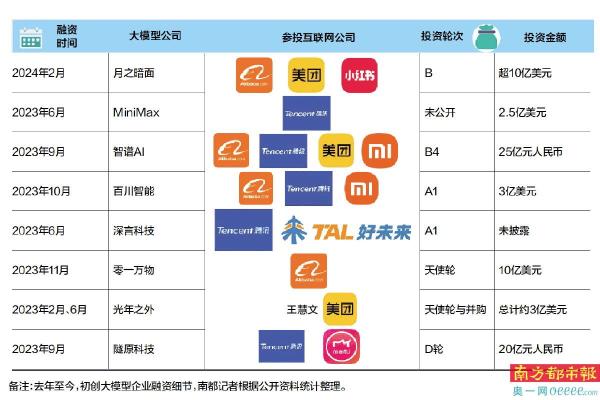 南都记者统计发现,针对大模型初创企业的投资,从去年至今,腾讯共投出3笔、阿里投出4笔、字节投出0笔、美团投出3笔、小米投出2笔。此外,腾讯还投资了AIGC相关企业深言科技,百度投资了AIGC相关企业西湖心辰、中科加禾和无问芯穹。