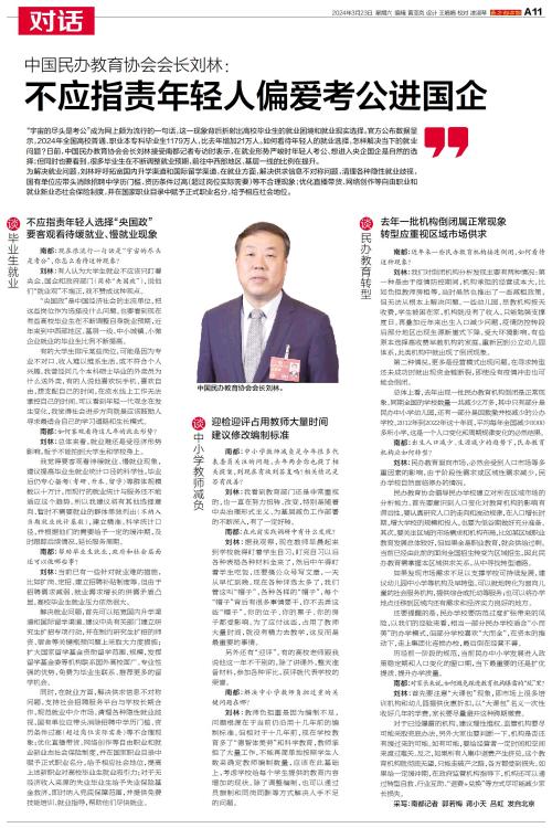 “宇宙的尽头是考公”成为网上颇为流行的一句话,这一现象背后折射出高校毕业生的就业困境和就业现实选择。官方公布数据显示,2024年全国高校普通、职业本专科毕业生1179万人,比去年增加21万人。如何看待年轻人的就业选择,怎样解决当下的就业问题?日前,中国民办教育协会会长刘林接受南都记者专访时表示,在就业形势严峻时年轻人考公、想进入央企国企是自然的选择;但同时也要看到,很多毕业生在不断调整就业预期,前往中西部地区、基层一线的比例在提升。