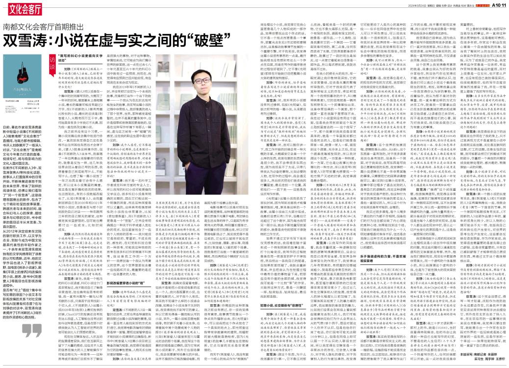 日前,著名作家双雪涛携最新中短篇小说集《不间断的人》做客南都“文化会客厅”直播间,与南方都市报编辑、书评人刘铮展开了一场深入对谈。
