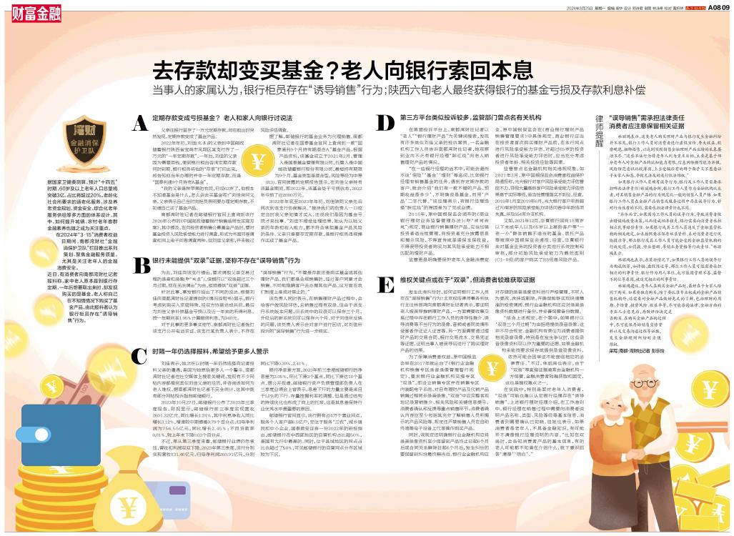 近日,有消费者向南都湾财社记者报料称,家中老人原本是到银行存定期,一年后想要取出来时,却发现购买的是基金。老人称自己在不知情情况下购买了基金产品,由此报料者认为银行柜员存在“诱导销售”行为。