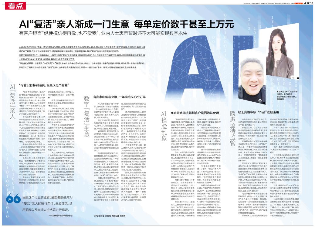 AI“复活”亲人渐成一门生意 每单定价数千甚至上万元