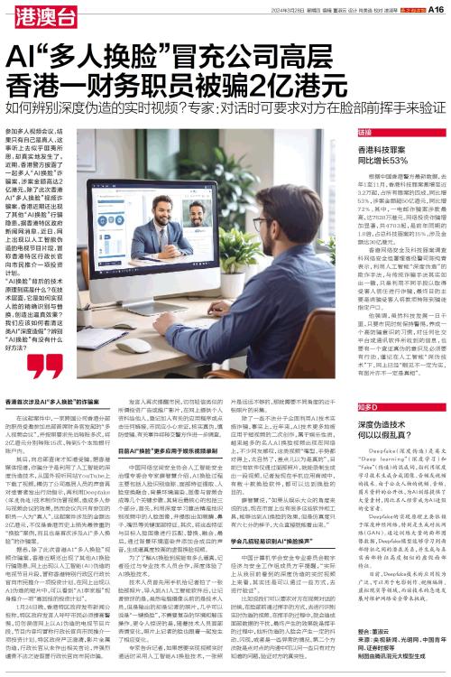 AI“多人换脸”冒充公司高层 香港一财务职员被骗2亿港元