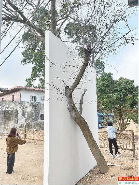 在阳江市阳东区东城镇石仑村的一条小路旁,长出了一棵神奇的“画中树”,既不是AI生成的也不是3D制作的。它背靠屋墙,两条树干穿破“画布”,顺着黑色简笔画向上生长。这棵“画中树”近日成为了新网红打卡点,吸引众多市民慕名前来。