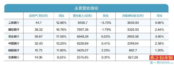 六大国有行的业绩与上年相比,究竟表现如何?日前,南都·湾财社记者围绕营业收入、归母净利润、分红、净息差、不良贷款率等核心指标进行了横向对比与分析。