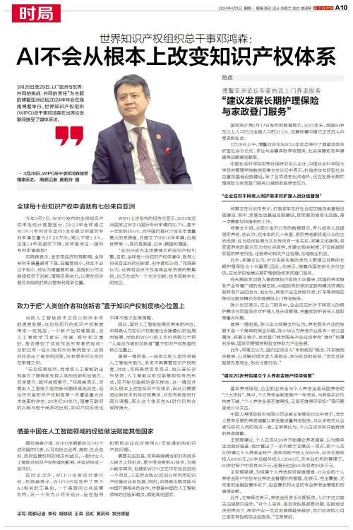 3月26日至29日,以“亚洲与世界:共同的挑战,共同的责任”为主题的博鳌亚洲论坛2024年年会在海南博鳌举行,世界知识产权组织(WIPO)总干事邓鸿森在出席论坛期间接受了媒体采访。