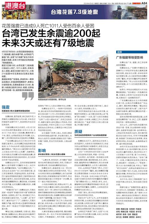 4月3日7时58分,台湾花莲县海域发生7.3级地震,随后余震不断。