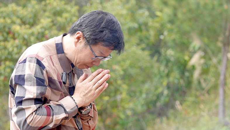 再度登上龙身建山,陡峭的山坡上,烈日刺眼,每个人身上的衣服都几乎湿透了。陈正强与亲戚们一同将祖坟上的尘土清理干净,于每座坟前各倒了三杯白酒与三杯饮料,再认真摆好祭品,便开始了清明正式的祭祖。