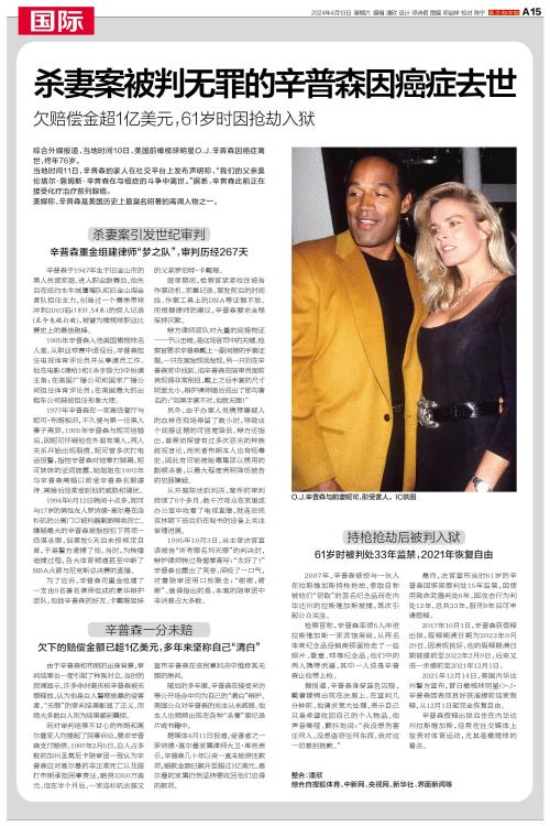 当地时间10日,美国前橄榄球明星O.J.辛普森因癌症离世,终年76岁。