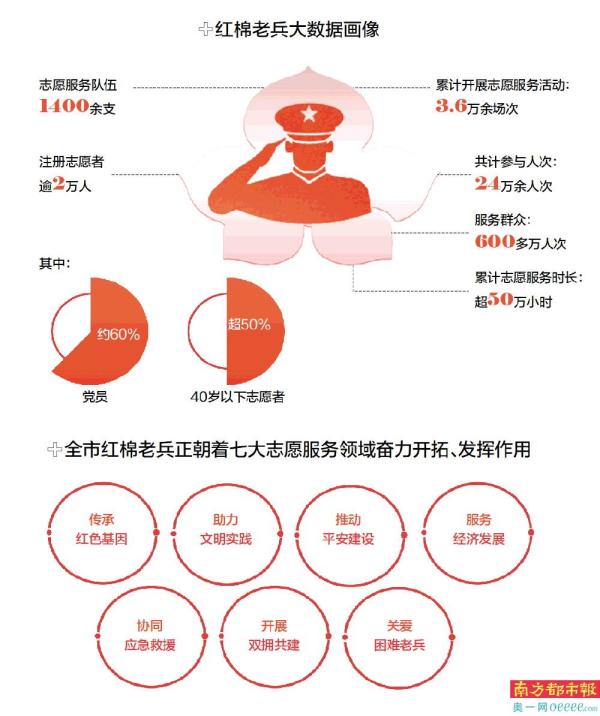 据南都在研讨会上发布的红棉老兵大数据画像披露,目前全市共组建各级红棉老兵志愿服务队伍1400余支,退役军人注册志愿者逾2万人,其中党员占比约60%,40岁下志愿者占比超50%。