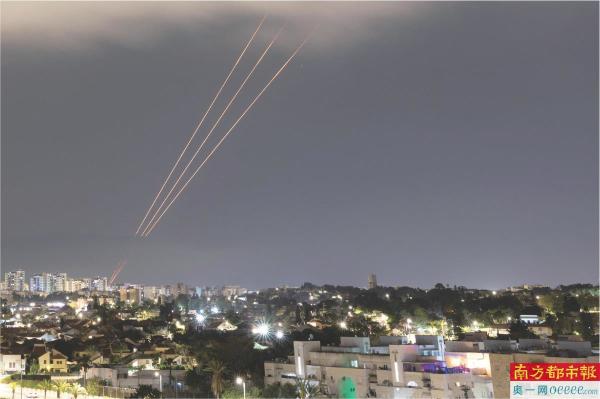 以色列军方发言人说,超过300个无人机和导弹射向以色列,其中超过99%被拦截。在以色列经济中心特拉维夫上空,以色列防空系统启动拦截在黑夜中划出的火光清晰可见。