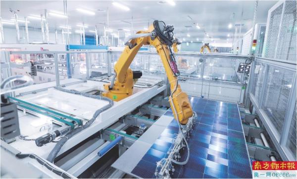 在浙江省金华市一家民营企业,智能化车间的自动化生产线机械臂在生产晶硅太阳能电池片。 新华社发