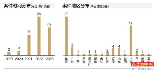 南都记者统计了64起案件时间分布与地区分布,从时间来看,近五年的案件数量总体呈上升趋势,并在2022年呈现爆发态势。该趋势与数字时代下社交媒体在工作场景的广泛应用趋势是一致的,并与新冠疫情期间大量工作线上开展有关。而从地区分布来看,隐形加班案例集中于北京、上海两大经济较为发达的地区。