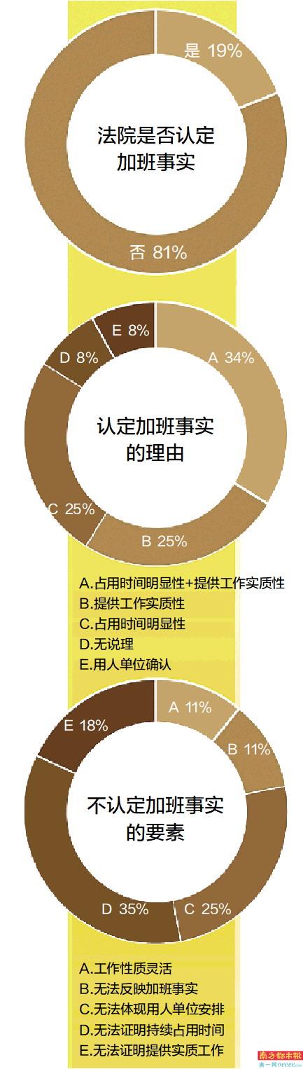 南都记者进一步梳理法院裁判文书发现,在当前有关隐形加班的司法裁判中,对于隐形加班事实的认定相对严格。在梳理的64起隐形加班相关案例中,仅12起被认定为加班,超80%的案件不支持加班事实认定。