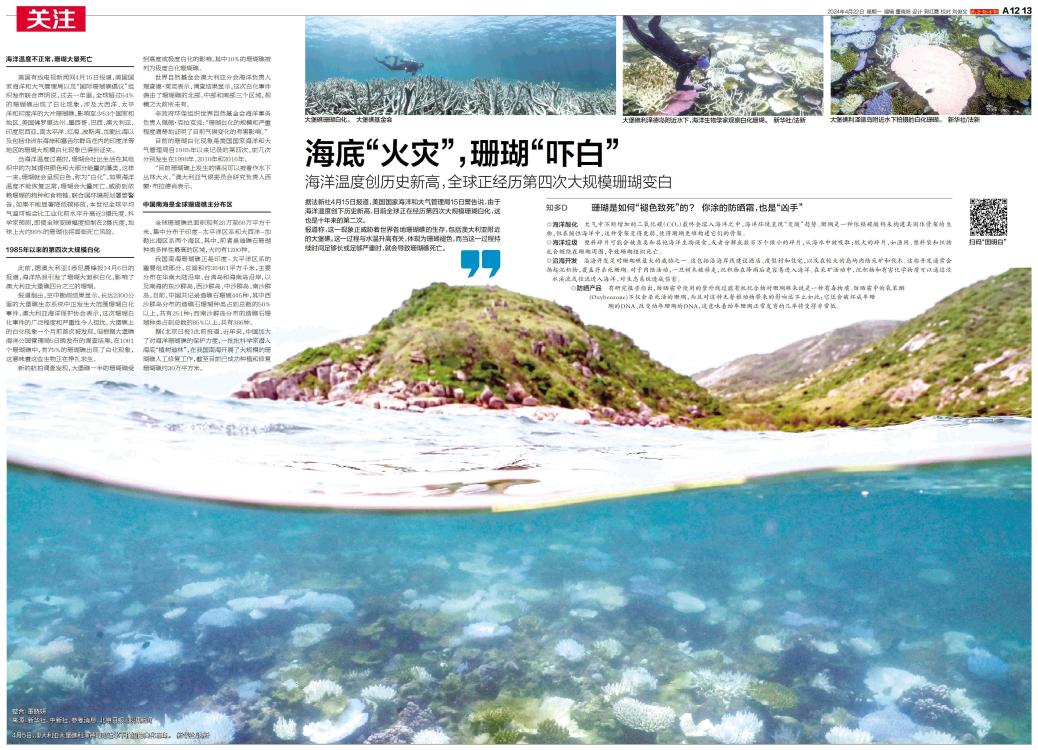 据法新社4月15日报道,美国国家海洋和大气管理局15日警告说,由于海洋温度创下历史新高,目前全球正在经历第四次大规模珊瑚白化,这也是十年来的第二次。