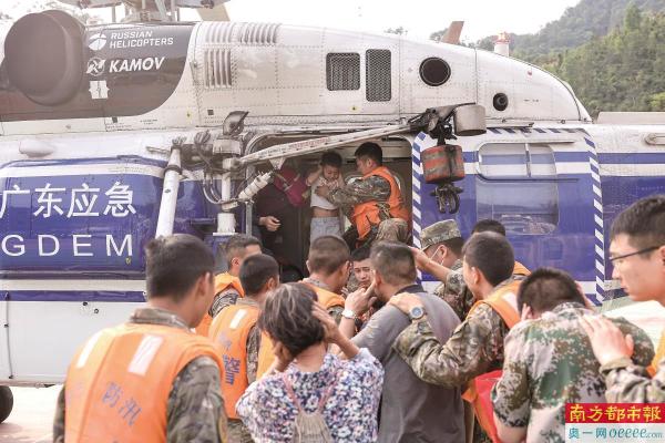应急人员带领当地居民乘坐直升机转移。 南方日报记者 郑新洽 董天健 摄