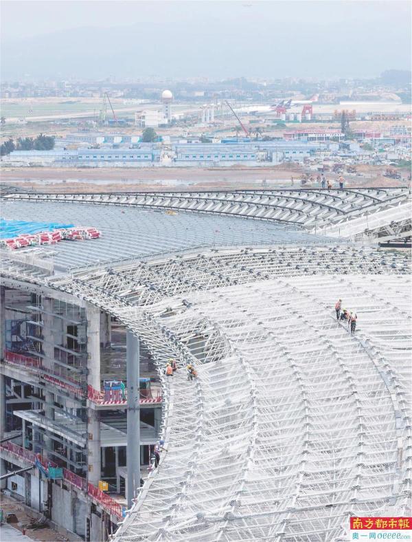 4月26日,建设者在广州白云机场T3航站楼钢结构上施工。广州白云国际机场三期扩建工程T3航站楼屋面网架呈波浪形,流畅起伏的曲线构成片片花瓣,展现出“花开羊城·羊城花冠”的建筑意象。 新华社发