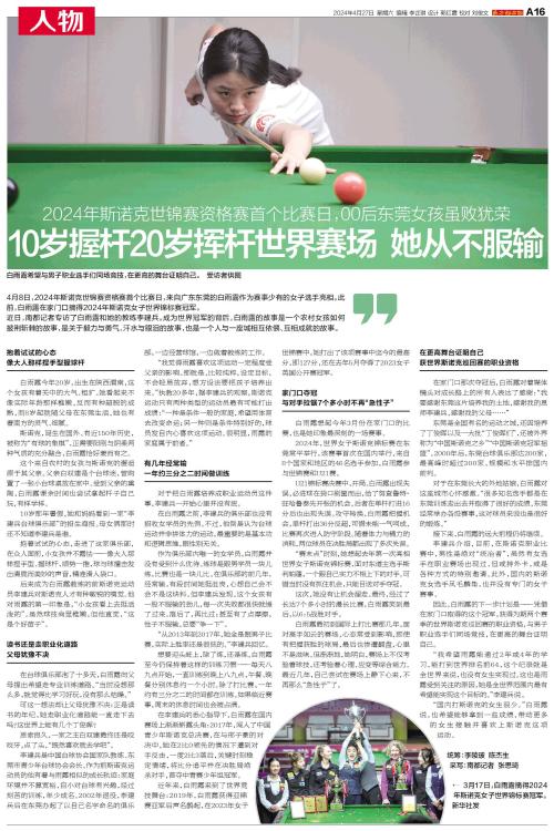 4月8日,2024年斯诺克世锦赛资格赛首个比赛日,来自广东东莞的白雨露作为赛事少有的女子选手亮相。